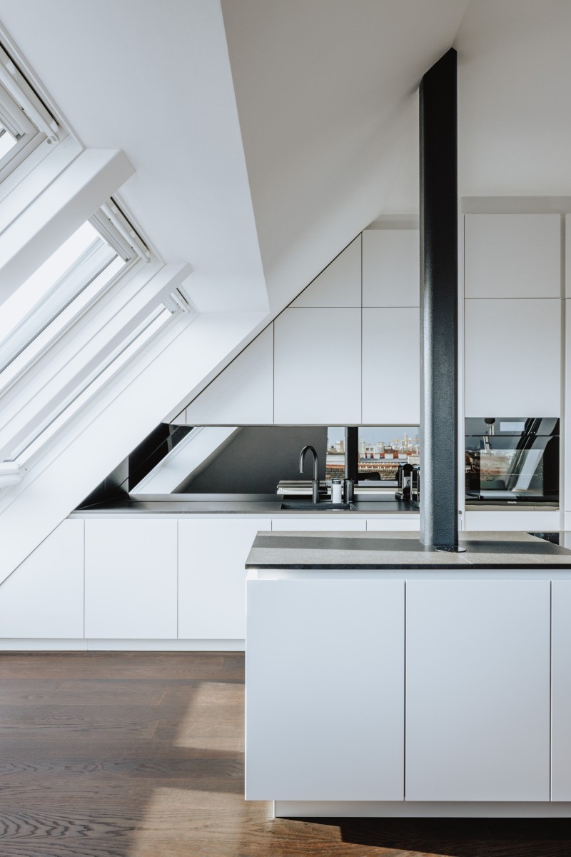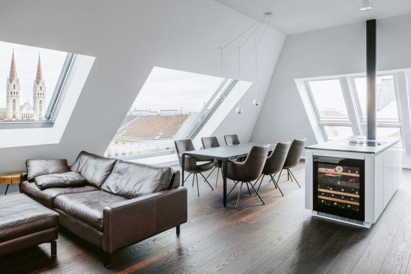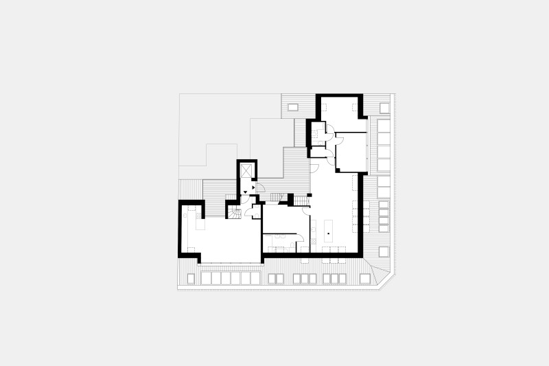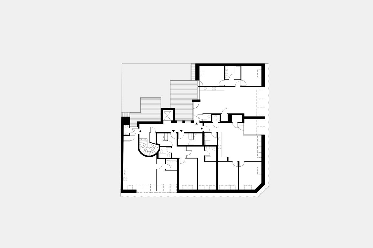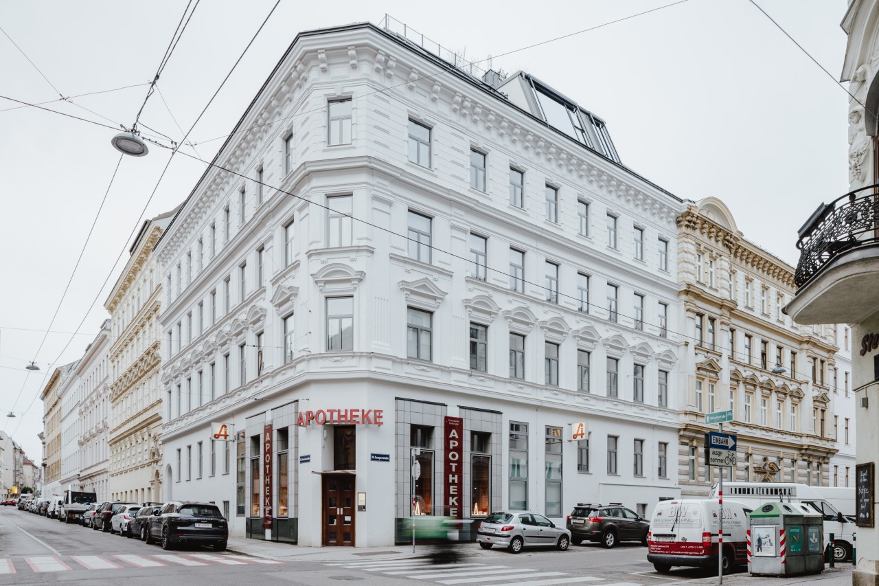 Das Anfang des 20. Jahrhunderts erbaute Eckzinshaus mit Apotheke und darüberliegenden Mietwohnungen wurde seit seiner Entstehung nur in kleinerem Rahmen durch Wohnungssanierungen und -zusammenlegungen verändert, ohne in die Struktur einzugreifen. Durch die Überbauung des Lichthofs konnten die Nebenräume der Apotheke direkt miteinander verbunden und die Funktionsabläufe verbessert werden. Der Verkaufsraum blieb durch die sensible Sanierung im Originalzustand erhalten. In den Regelgeschoßen wurden die 30 bis 85 m² großen Wohnungen neu konfiguriert und umfassend saniert – zwei Wohnungen pro Geschoß konnten hofseitig mit Balkonen erweitert werden. Der Aufzug ist zwischen den Balkontürmen positioniert und reicht bis ins Dachgeschoß. Hier befinden sich nun fünf Wohnungen auf je zwei Etagen mit Größen zwischen 50 und 140 m², von denen jede über großzügige Terrassen mit weitem Blick über die Stadt verfügt.