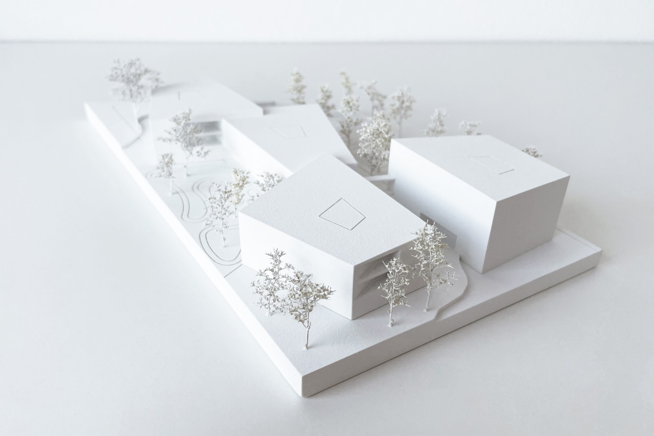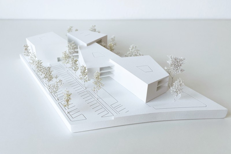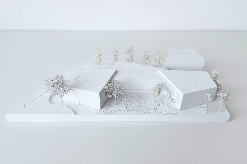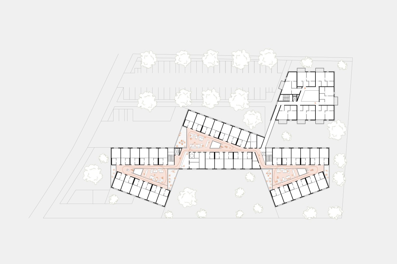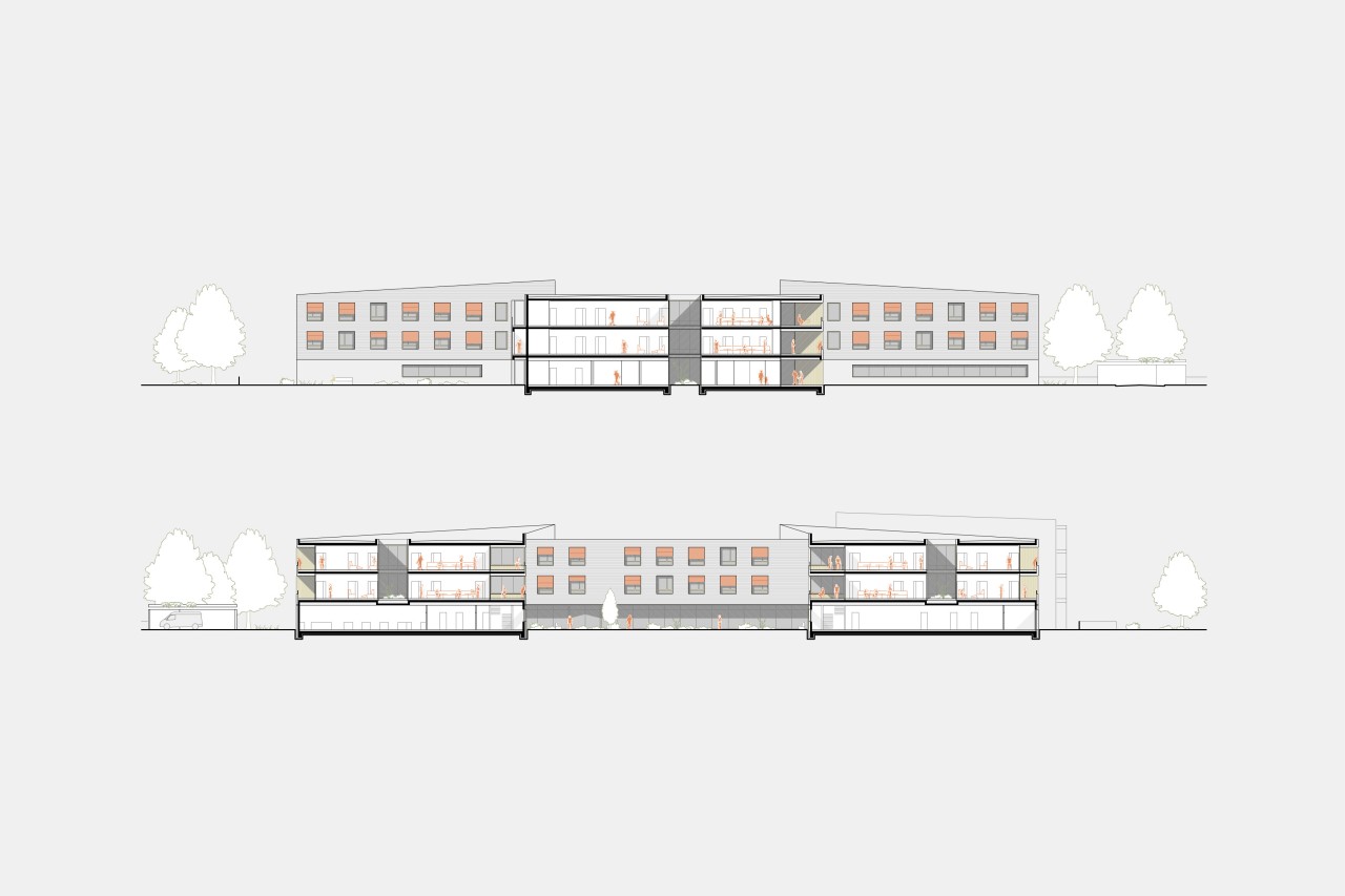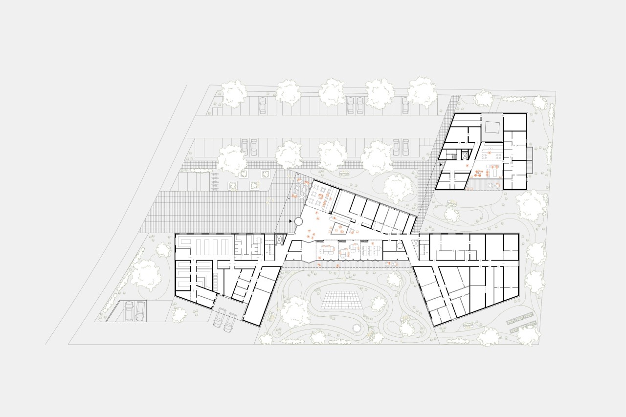 Das neue Seniorenheim liegt an der Schnittstelle zwischen Acker und Ein- und Mehrfamilienhausbebauung am Siedlungsrand von Attergau. Struktur und Körnung werden im Verhältnis aufgenommen und auf den Neubau übertragen. Die aus dem Inneren entwickelte Form lässt eine Dreiteilung der Wohngruppen von außen ablesen. Der westliche Baukörper rahmt gemeinsam mit dem Mitteltrakt den Vorplatz und ermöglicht ein geschütztes Ankommen. Weiters umklammern die Baukörper den Demenzgarten, welcher sich nach Süden hin öffnet und durch diese Geste eine inklusive räumliche Trennung für demenzerkrankte Personen erzeugt. Im nord-östlichen Bereich des Grundstückes wird der viergeschoßige Baukörper der alternativen Wohnformen situiert und in derselben Formensprache wie das Seniorenheim weitergeführt.