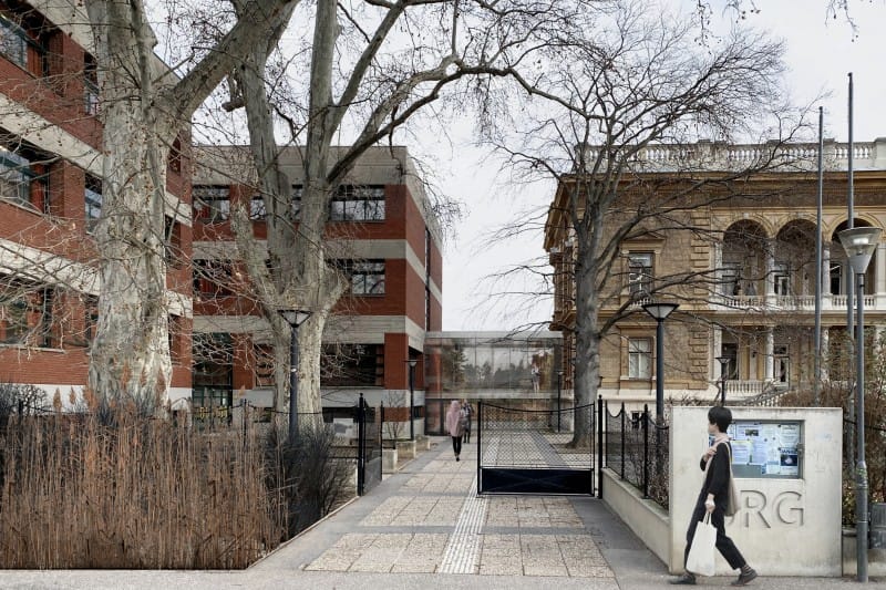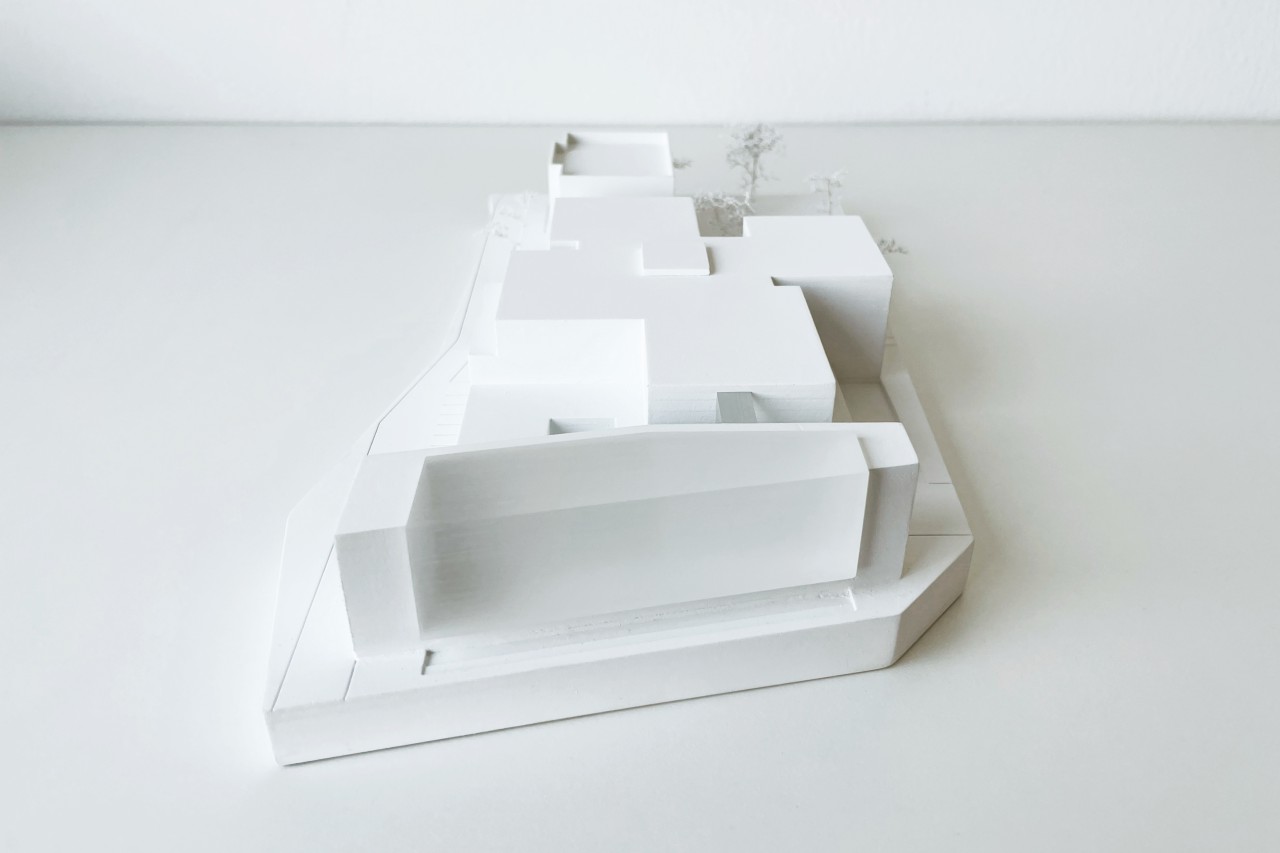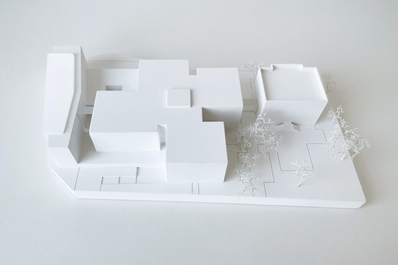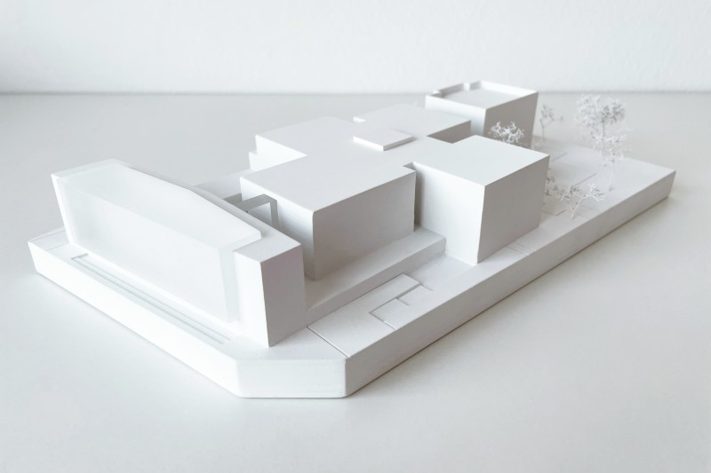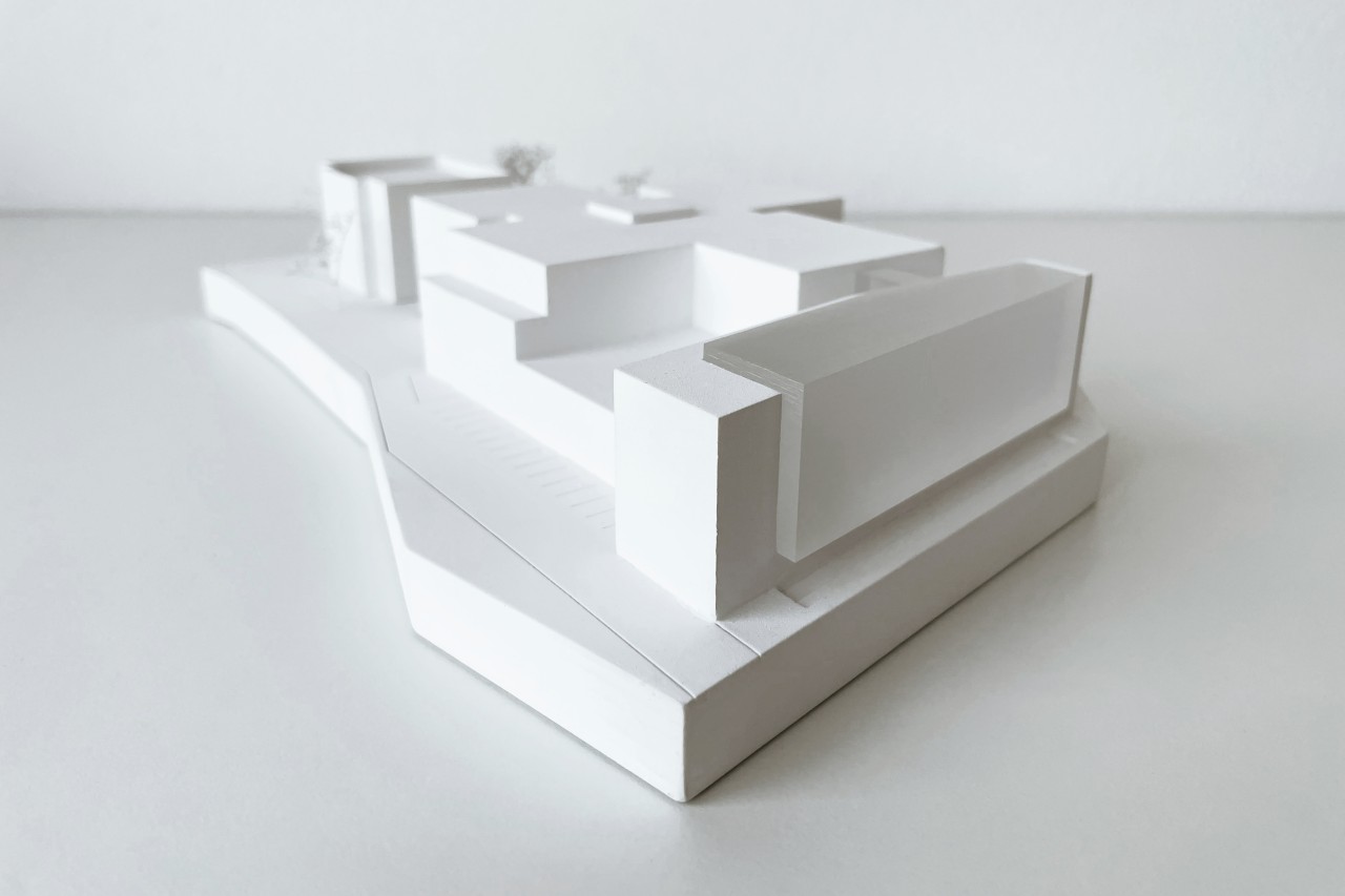 Zwei Grundgedanken bestimmten den Entwurf: Die Kraft und Klarheit des Vorhandenen soll gewürdigt und weitergeführt und mit einem Neubau ein zeitgenössischer Gegenpart zur historischen Burkhardvilla geschaffen werden. Die Bestandsschule besteht aus drei windradartig um eine zentrale Erschließung angeordneten Baukörpern. Dieser Logik folgend werden die vermeintlich fehlenden Teile ergänzt und damit eine Erweiterung der Struktur mit minimalen Eingriffen vorgeschlagen. Westlich davon bildet ein solitärer Neubau das Gegenüber zur Burkhardvilla. Ein eingeschoßiger Verbindungsbau verknüpft Alt- und Neubau. Alle Stammklassen werden im Bestand untergebracht, die Verwaltung in der Burkhardvilla. Im „Laborgebäude“ westlich des Klassentraktes sind alle Sonderunterrichtsräume versammelt. Zentrales Bindeglied ist die Tagesbetreuung, wo sich auch Bibliothek, Speisesaal und Mehrzweckraum befinden. Die natürlich belichtete und belüftete Turnhalle wird im Untergeschoß direkt westlich an das bestehende Schulhaus angebaut. Alle Nebenräume und Umkleiden finden im zweiten Untergeschoß Platz. Die Erschließung erfolgt über die Treppenhäuser des Laborgebäudes. Getrennte Zugänge für den Schulbetrieb sowie für externe Nutzer:innen sind problemlos realisierbar.