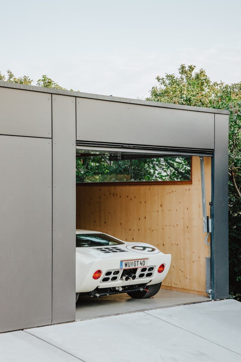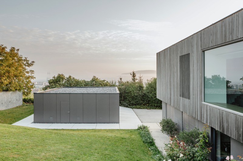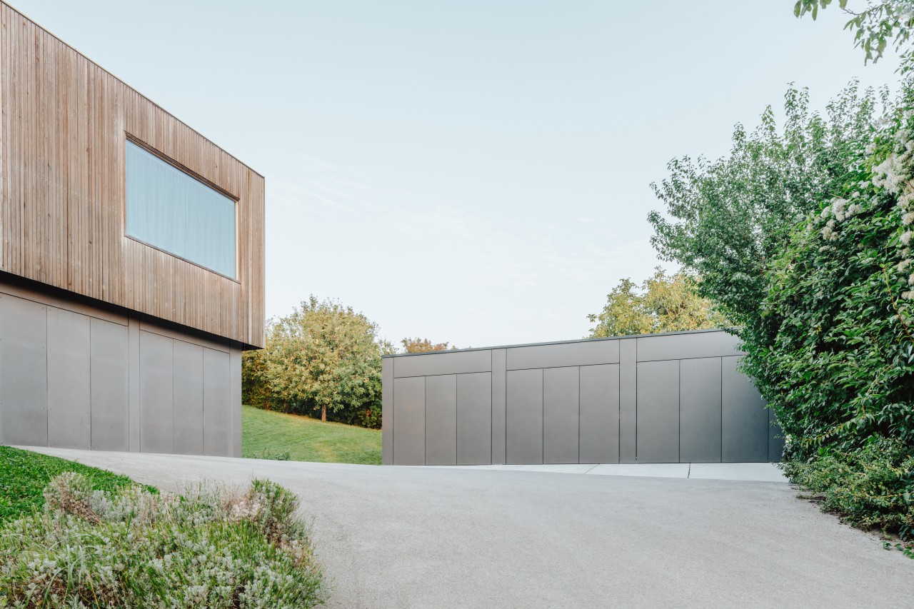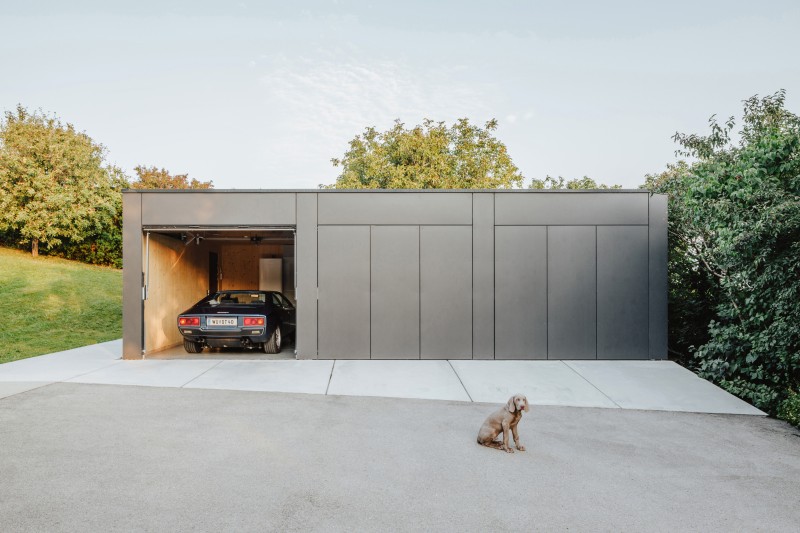 Um dem erhöhten Platzbedarf einer wachsenden Familie in einem von Johannes Kaufmann geplanten Einfamilienhaus gerecht zu werden, entschied man sich für einen behutsamen Eingriff: Die bestehende Garage im Wohngebäude wurde zu Zimmern mit einem weiteren Bad umgebaut. Als Ersatz dafür wurde eine neue Dreifachgarage mit rückseitigem Abstellraum errichtet. Das Materialkonzept des bestehenden Gebäudes wurde übernommen, um das Ensemble harmonisch zu ergänzen: Die neue Garage ist aus Massivholzelementen errichtet und mit Eternitplatten verkleidet. Die Betonplatten des Bestandes setzen sich um die neue Garage fort und bilden einen Rahmen. Ein Oberlichtband der alten Garage wurde ressourcenschonend im Neubau wiederverwendet.