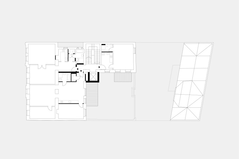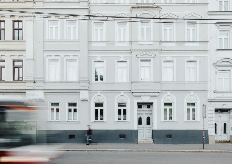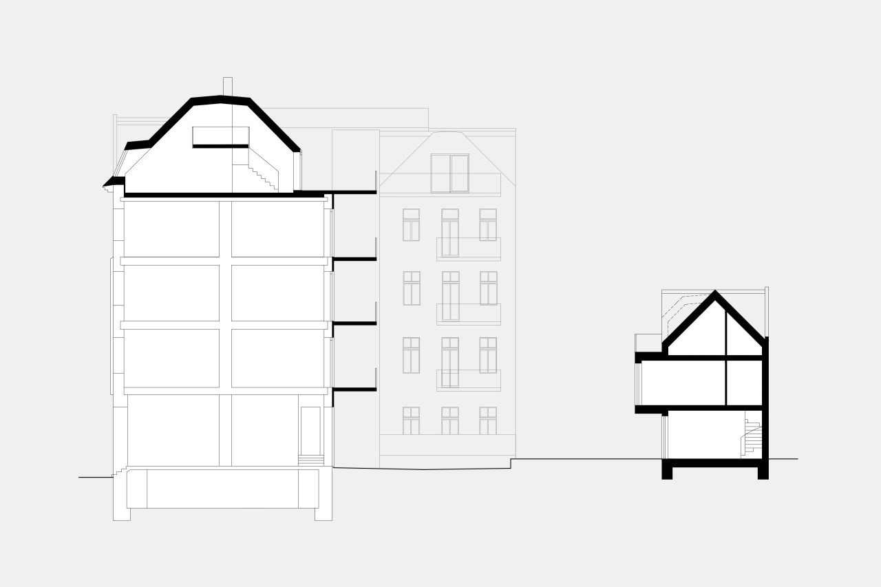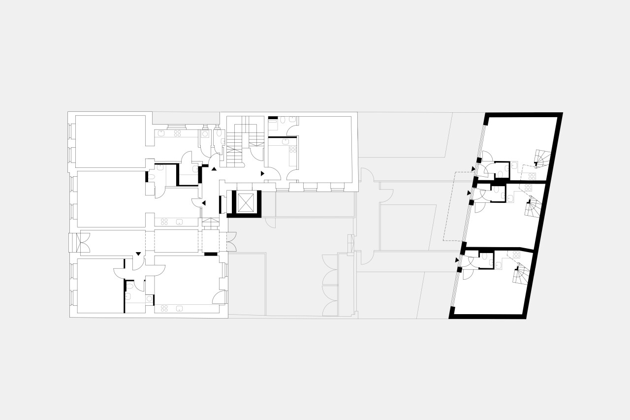 Beim Umbau und der Sanierung eines L-förmigen gründerzeitlichen Zinshauses entstanden im Straßentrakt drei Wohnungen pro Geschoß, zwei davon mit Balkon. Im Inneneck wurde ein Aufzug errichtet, das Dach wurde mit zwei Maisonetten und einer Kleinwohnung, jeweils mit Außenflächen, ausgebaut. In einem reihenhausartigen Hofgebäude an der rückwärtigen Seite des Grundstücks befinden sich drei „Townhouses“ mit vorgelagertem Garten. Diese sind dreigeschoßig mit einer Wohnküche im Erdgeschoß und Zimmern in Ober- und Dachgeschoß. Die kleine Wohnfläche ist zum Garten hin vollständig verglast, was zu einer optischen Erweiterung und einer engen Verbindung mit dem Außenraum führt.