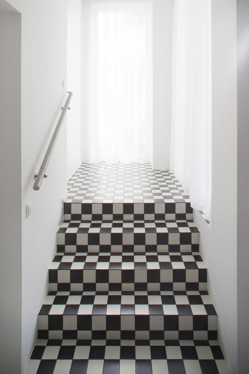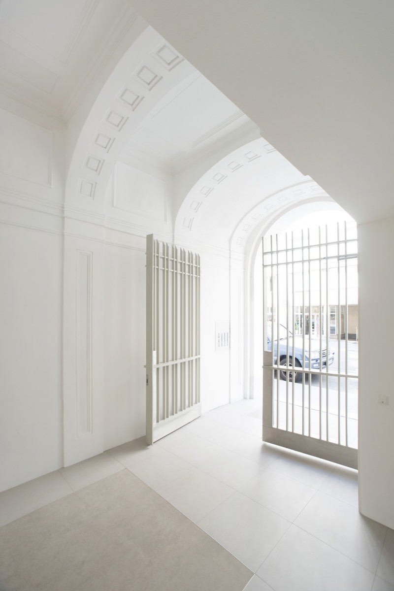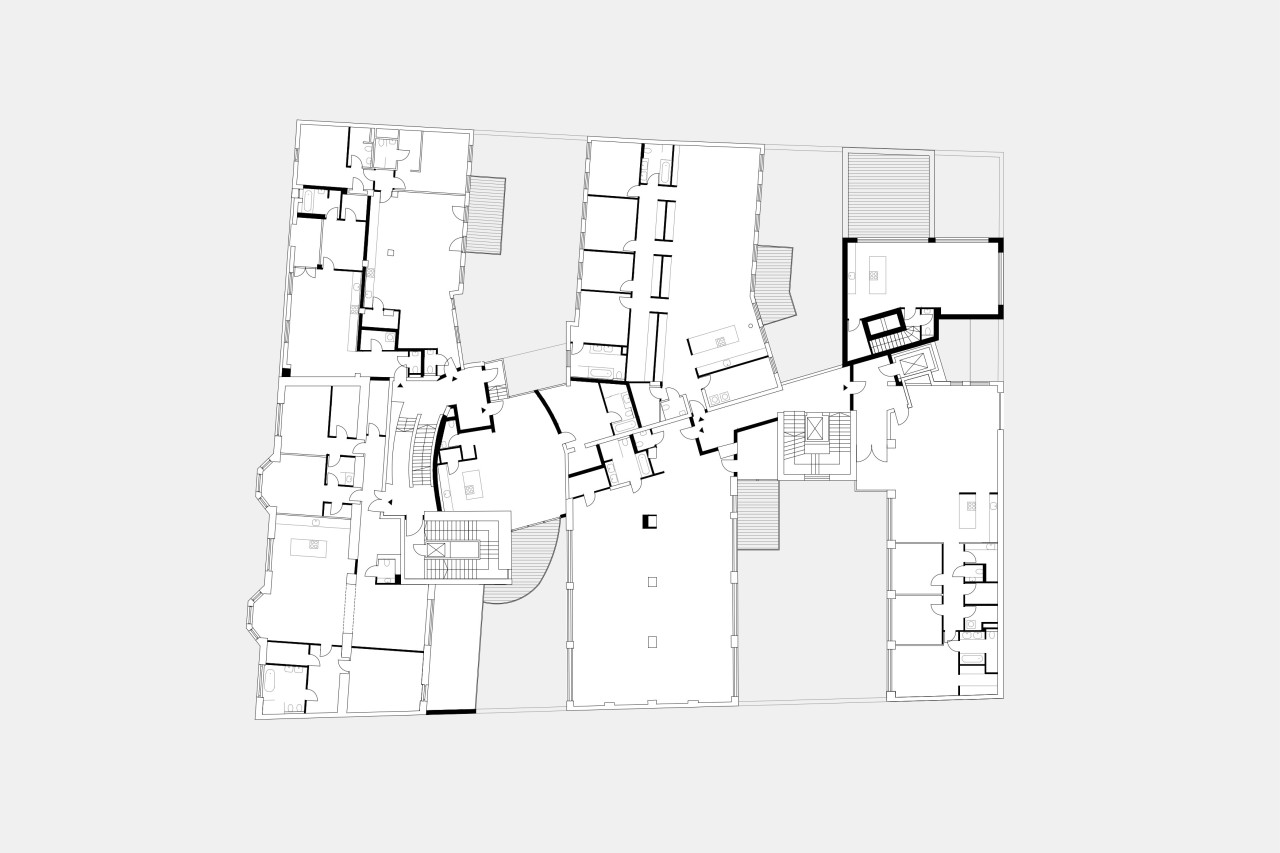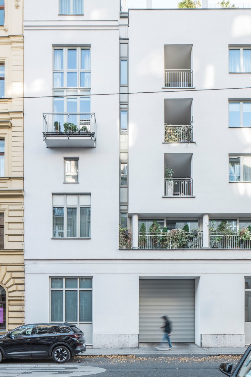 Die Liegenschaft besteht aus zwei nebeneinander liegenden Gebäuden mit jeweils drei Gebäudetrakten in der Tiefe des Grundstücks. Bei einem umfassenden Um- und Zubau in den 1990ern wurden durch eine dekonstruktivistische Maßnahme eine schräg liegende Erschließungsachse, ein ovales Stiegenhaus und ein Foyer implementiert. Aus diesem Eingriff resultierten drei Stiegenhäuser, die unterschiedliche Ebenen und Typologien in jedem Geschoß generierten. Das neue Konzept sah vor, das ovale Stiegenhaus aufzulassen, durch das Einziehen von neuen Geschoßdecken weitere nutzbare Flächen zu schaffen und das bisher vorwiegend als Bürohaus verwendete Gebäude zu einem Wohnhaus umzugestalten.