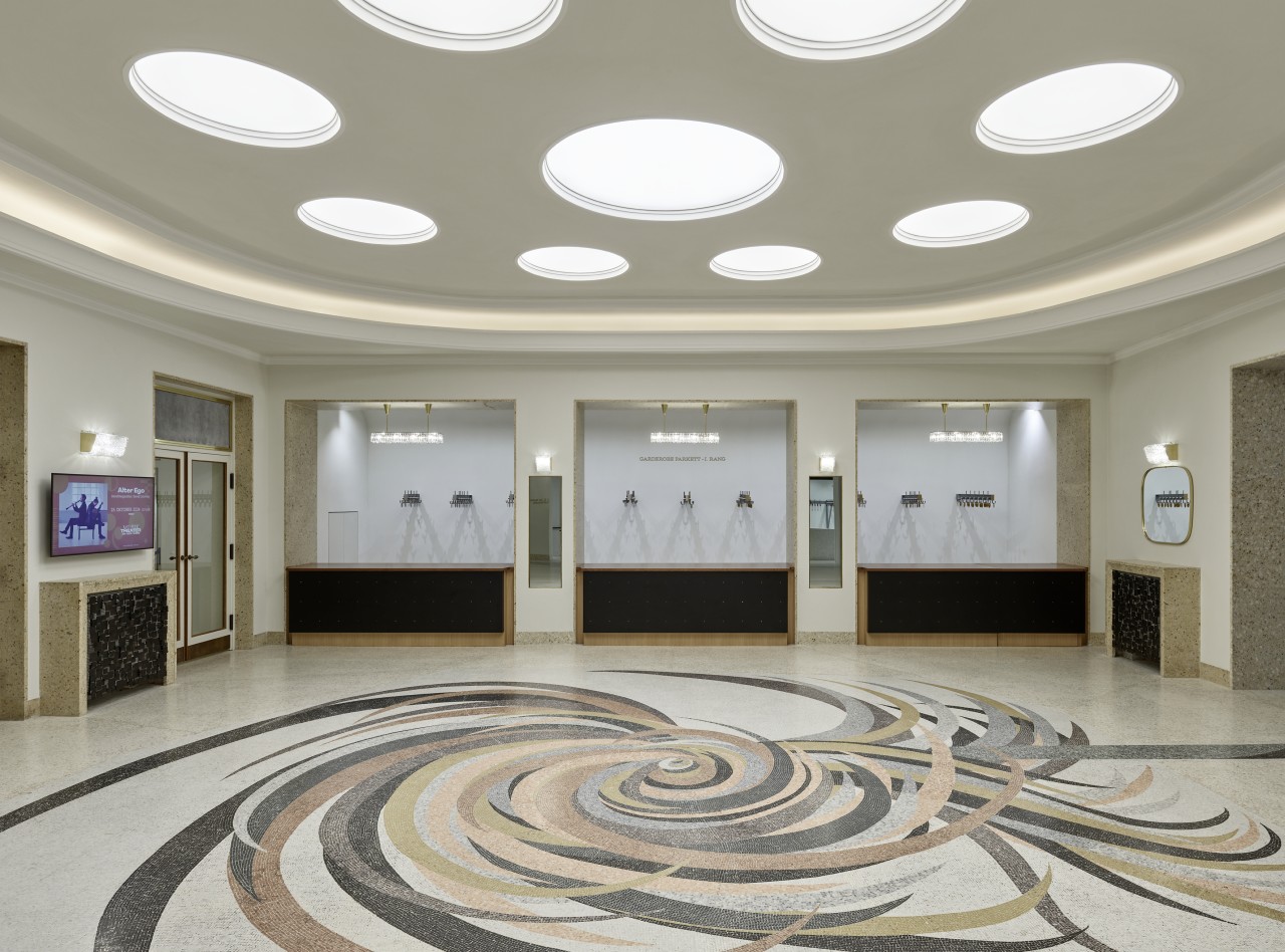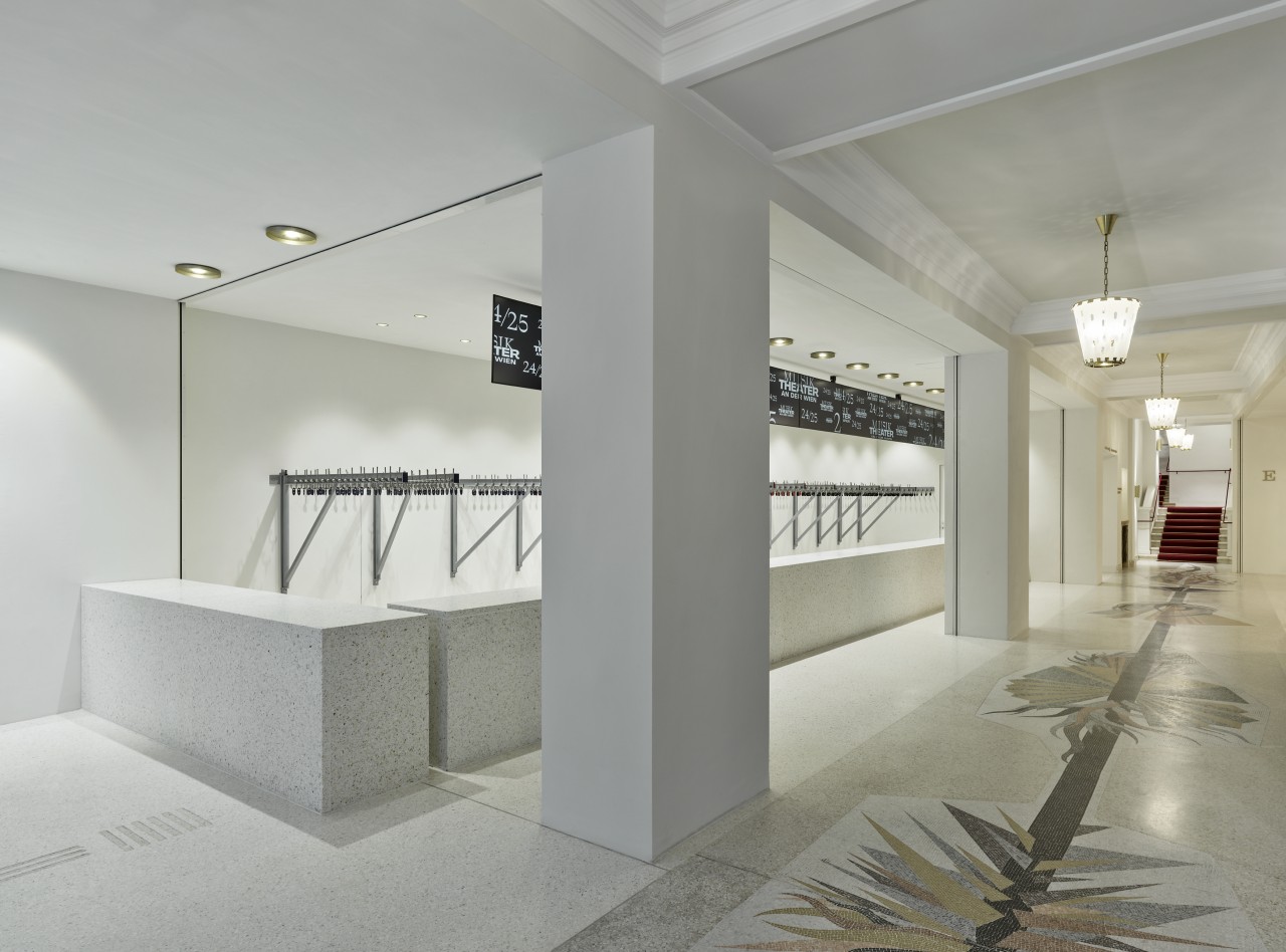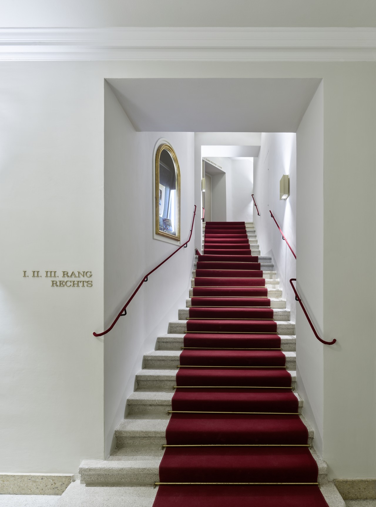 Das geschichtsträchtige Gebäude wurde durch die behutsame Sanierung und gezielte Eingriffe von Riepl Kaufmann Bammer Architektur in das 21. Jahrhundert überführt. Gemeinsam wurden Möblierungen entworfen, die respektvoll mit dem Bestand und dem architektonischen Konzept umgehen und dieses ergänzen. Bar- und Garderobenelemente aus Terrazzo erwecken den Eindruck gemeinsam mit dem Boden aus einem Stück gegossen zu sein. Dunkelblau lackierte Eschenpaneele und Verbauten schaffen einen fließenden Übergang zwischen Boden- und Deckenhorizont. In denkmalgeschützen Teilbereichen wurden Möblierungen zeitgemäß in ihre ursprünglichen Geometrien und Haptiken zurückgeführt. Das historische Leitsystem – bestehend aus goldenen Buchstaben von Architekt Niedermoser aus den 1960er Jahren – wurde an die neu entstandenen Raumabfolgen und Terminologien angepasst, um neutrale Symbole ergänzt und erweitert. Im Hinterhaus wurden Sozialräume, Chorsaal, Maske und Ankleider:innen mittels Tischlermöbeln individuell an die Nutzerbedürfnisse für einen modernen Opernbetrieb angepasst.