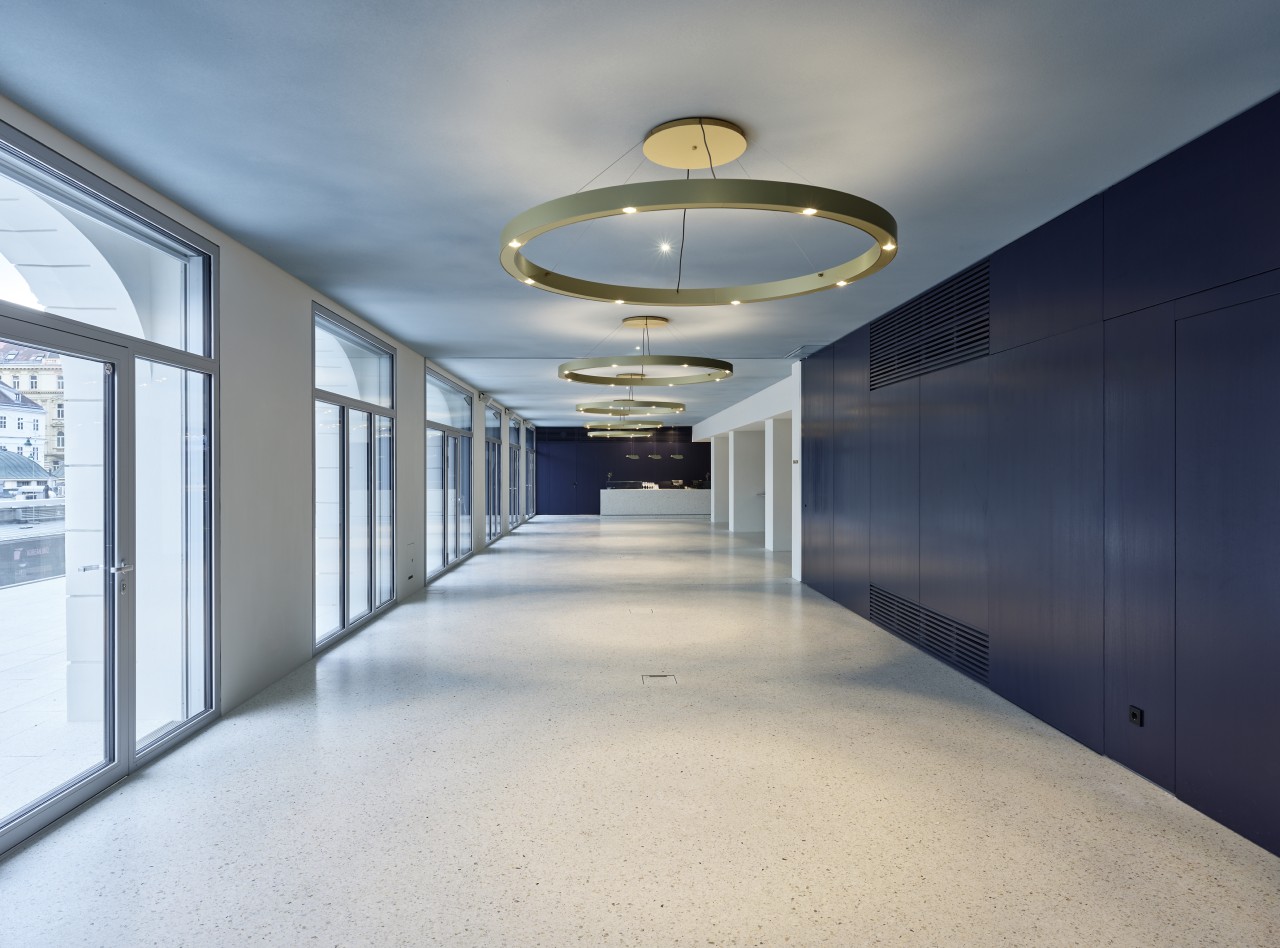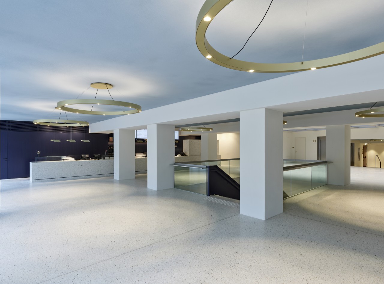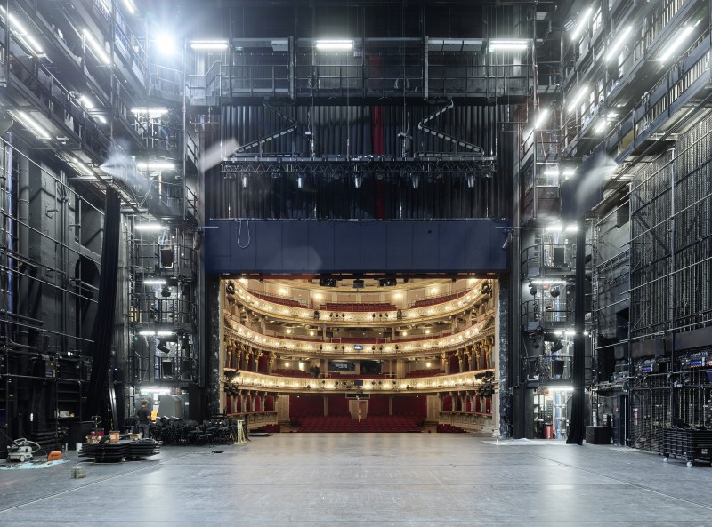 Das geschichtsträchtige Gebäude wurde durch die behutsame Sanierung und gezielte Eingriffe von Riepl Kaufmann Bammer Architektur in das 21. Jahrhundert überführt. Gemeinsam wurden Möblierungen entworfen, die respektvoll mit dem Bestand und dem architektonischen Konzept umgehen und dieses ergänzen. Bar- und Garderobenelemente aus Terrazzo erwecken den Eindruck gemeinsam mit dem Boden aus einem Stück gegossen zu sein. Dunkelblau lackierte Eschenpaneele und Verbauten schaffen einen fließenden Übergang zwischen Boden- und Deckenhorizont. In denkmalgeschützen Teilbereichen wurden Möblierungen zeitgemäß in ihre ursprünglichen Geometrien und Haptiken zurückgeführt. Das historische Leitsystem – bestehend aus goldenen Buchstaben von Architekt Niedermoser aus den 1960er Jahren – wurde an die neu entstandenen Raumabfolgen und Terminologien angepasst, um neutrale Symbole ergänzt und erweitert. Im Hinterhaus wurden Sozialräume, Chorsaal, Maske und Ankleider:innen mittels Tischlermöbeln individuell an die Nutzerbedürfnisse für einen modernen Opernbetrieb angepasst.