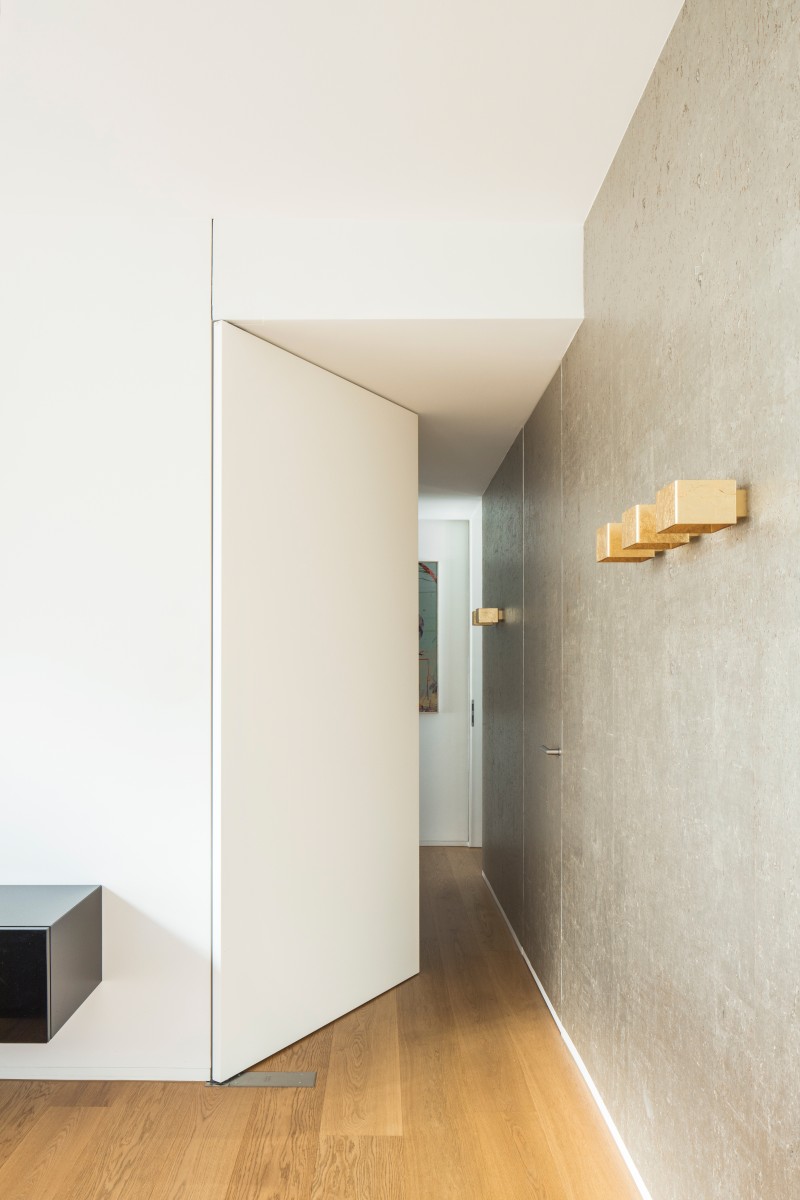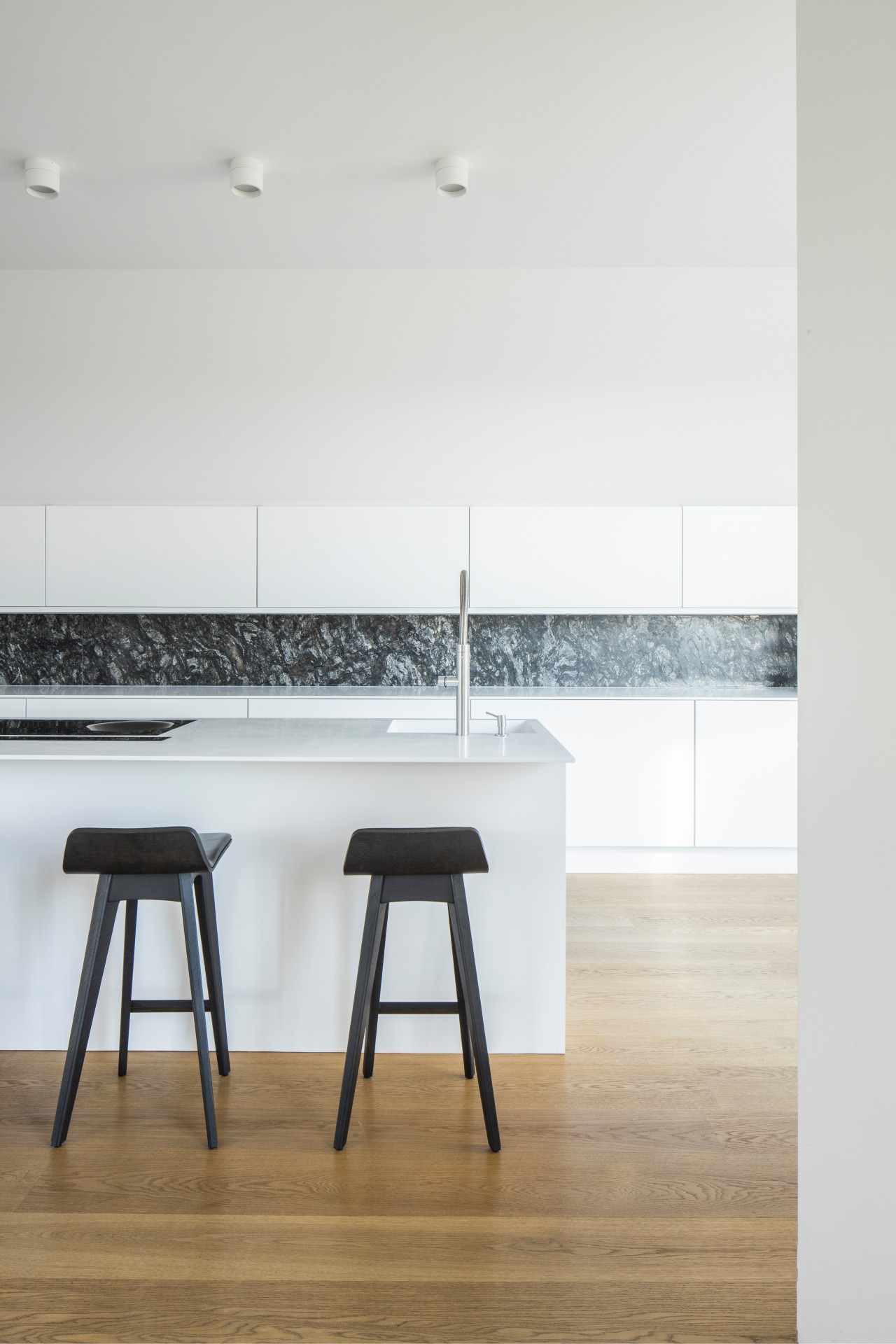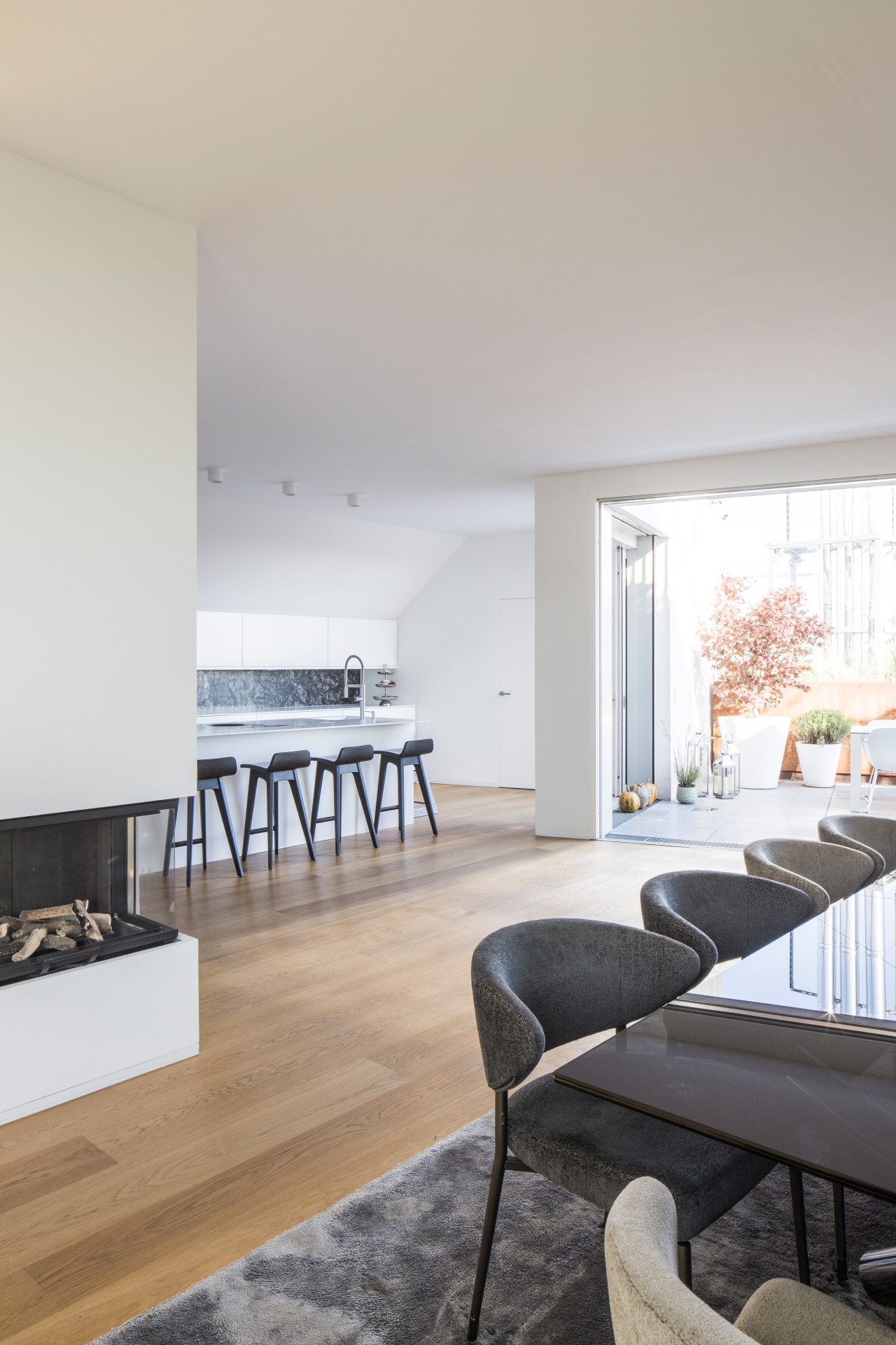 Über einen beidseitig verglasten Vorraum gelangt man in die fast 110 m² große Wohnküche, die das Herzstück der Wohnung ist. Zwei Terrassen sorgen für ausreichend Belichtung und privaten Freiraum. Die minimalistisch gestaltete Küche ist in ihrer Erscheinung zurückhaltend, um einer haptischen und farbenfrohen Möblierung den Vortritt zu überlassen, und versteckt Zugänge zu Speisekammer und Gäste-WC. Der Wohnbereich wird durch einen mittig liegenden Kamin in Szene gesetzt und gewährleistet mittels einer eleganten einläufigen Stiege den Zugang zur Dachterrasse mit Ausblick über Wien. Drei private Schlafzimmer mit Bädern en suite werden mit einer bündigen Pivot-Türe vom Wohnbereich abgetrennt und bieten einen Rückzugsbereich. Die Wohnung befindet sich im Objekt „Seidengasse“ und zeigt die unterschiedlichen Facetten und Möglichkeiten dieses individuellen Bauvorhabens.